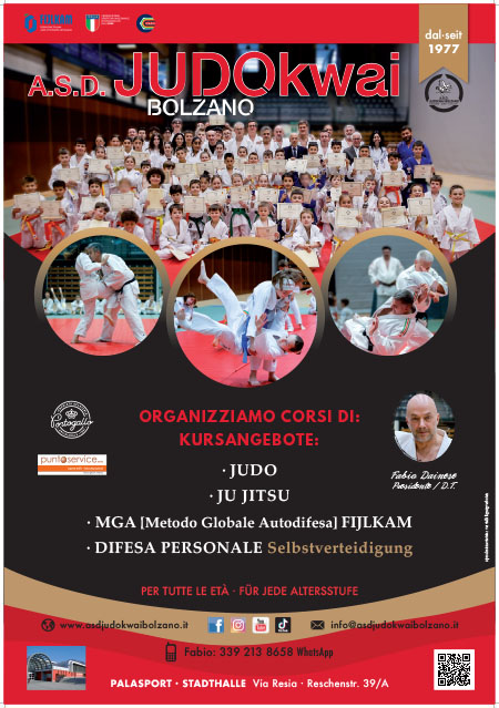 L’A.S.D. Judokwai Bolzano, dal 1977, si occupa della diffusione delle Arti Marziali, Judo, Ju Jitsu, Difesa Personale MGA (Metodo Globale Autodifesa FIJLKAM) e Difesa Personale con Corsi aperti ad ambo i sessi e tutte le età (sia Principianti che Avanzati), a partire dal 4° anno in poi, ai quali si può accedere in qualsiasi momento della Stagione sportiva in corso con possibilità di Prove gratuite. Per ulteriori informazioni, non esitate a contattarci.